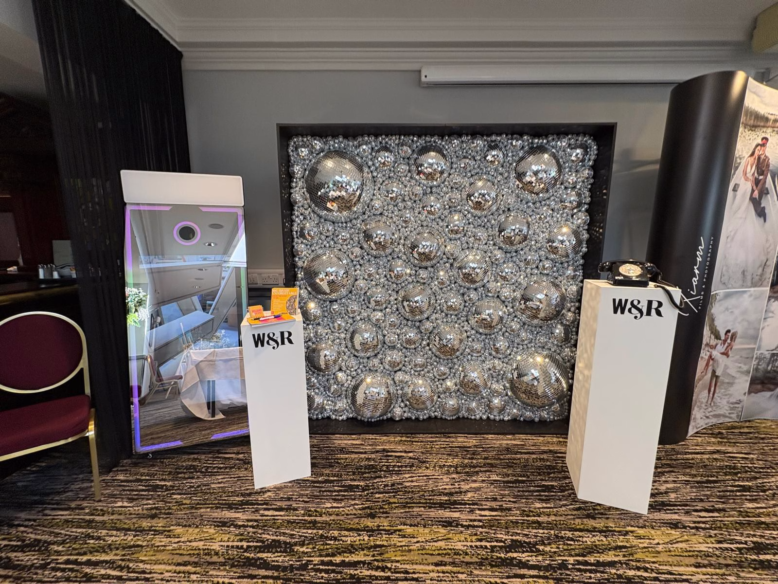 Crafted with style and impact in mind, the Disco Ball Wall seamlessly blends with a range of event themes, from modern luxe to fun and playful. Its bold design makes it a striking backdrop for photos, speeches, or dance floor moments, ensuring your celebration shines from every angle. Pair it with one of our photo booths for the ultimate party experience, or let it stand alone as the centrepiece of your décor.