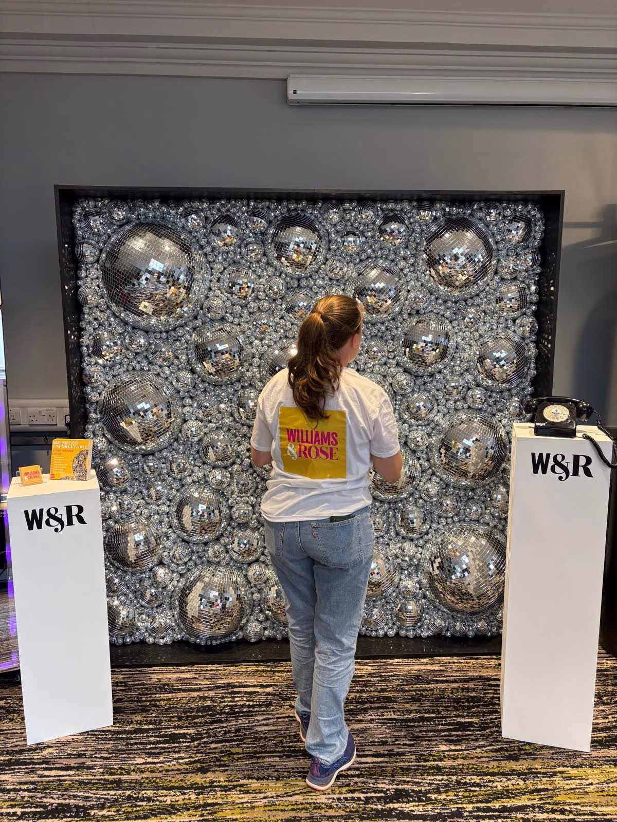 Measuring 2m wide by 2m tall, our Disco Ball Wall Backdrop is crafted from over 1,500 individual disco balls, ranging in size from 50cm to 2cm in diameter. This unique mix of scales creates incredible depth, texture, and light reflection, making it a truly one-of-a-kind centrepiece for your event.