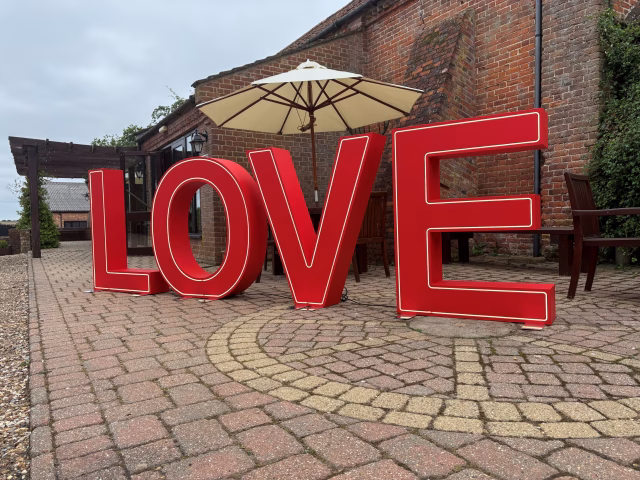 Illuminate your special moments with our captivating “Edge” LOVE Letters, standing 4ft tall and designed to make a statement. These striking 3D letters, painted in a vibrant red, are the perfect addition to weddings, anniversaries, and parties, creating an unforgettable atmosphere. Each letter features recessed LED lighting on the front face, casting a bright, inviting glow that enhances any setting.