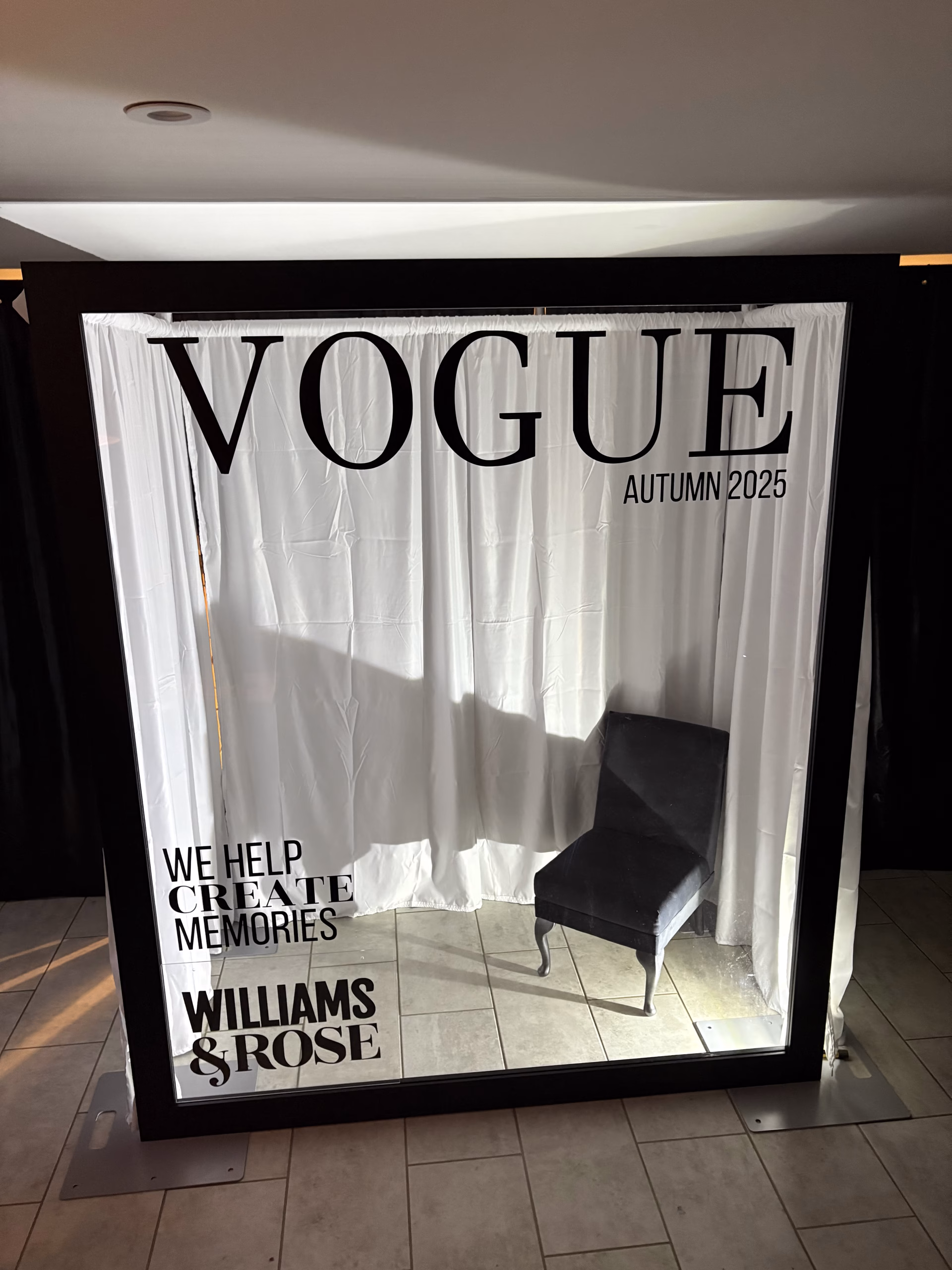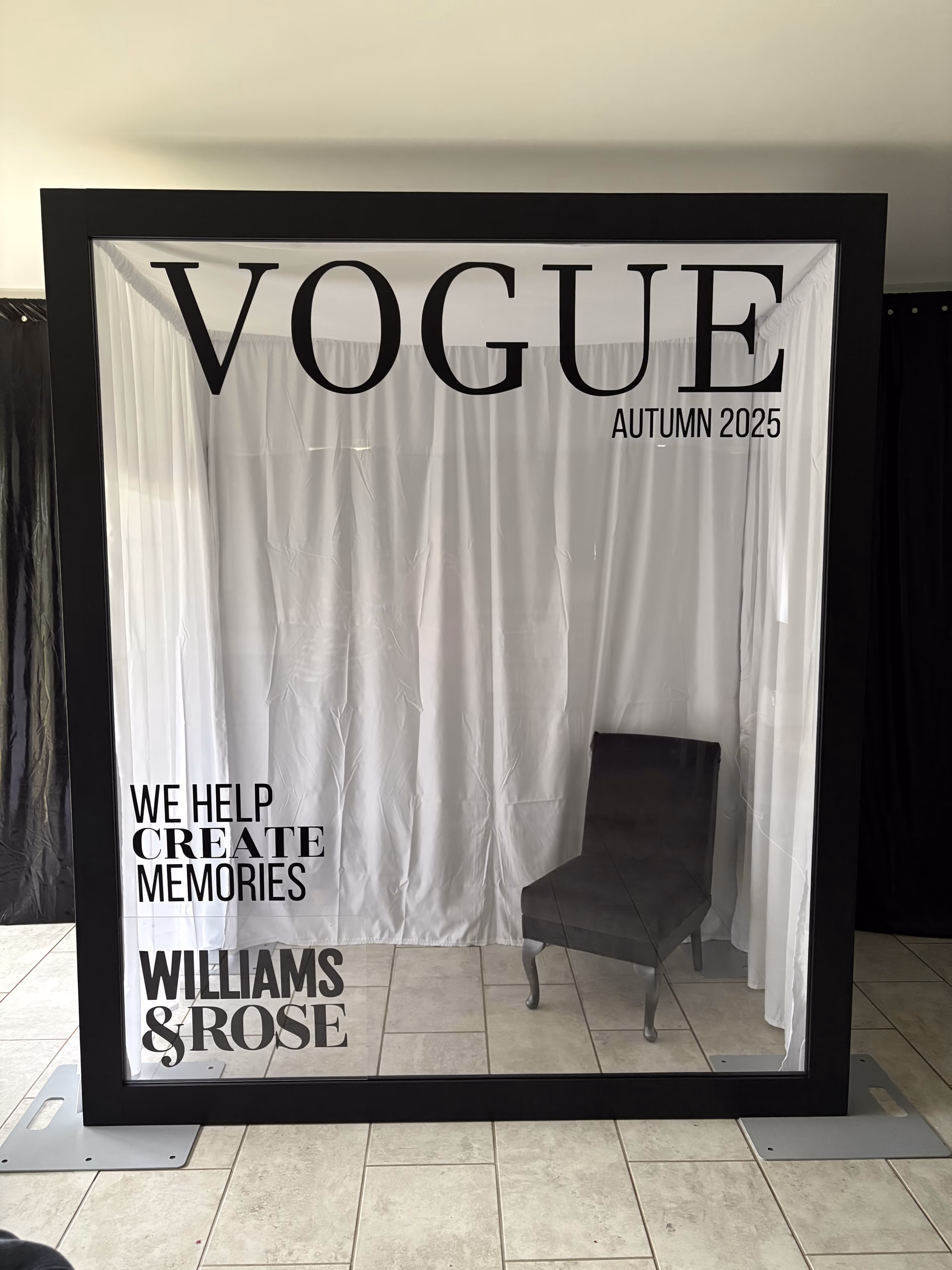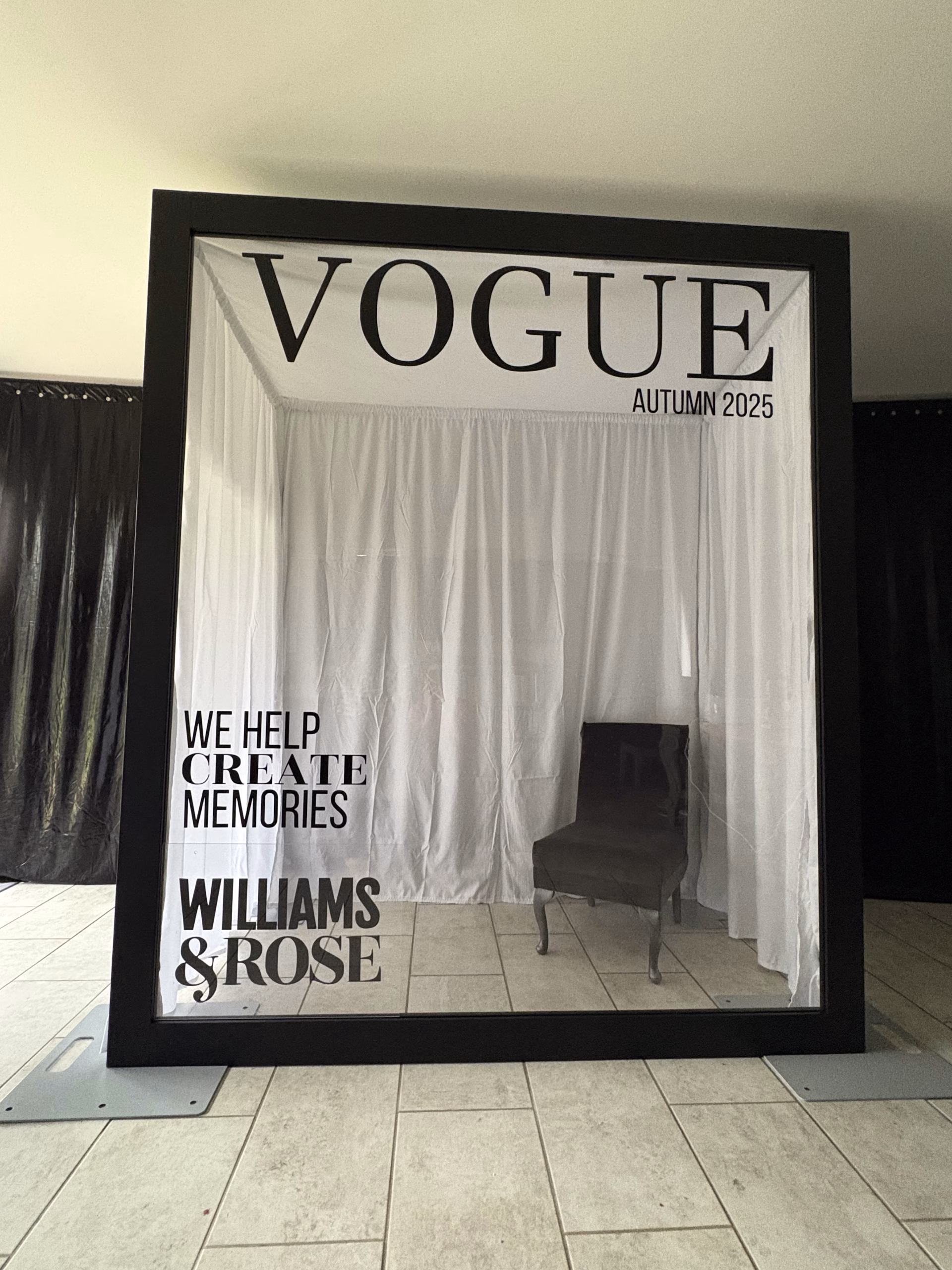Introducing the Magazine Cover Booth, your ticket to feeling like a cover star. Step into this chic enclosure, featuring fabric sides and a versatile black or white backdrop. Choose to tailor your experience further with a backdrop of your choice from our collection, or if you have something specific in mind get in contact as we love a custom build. The front boasts a stylish white timber frame with an acrylic inlay, perfect for customising with your name or message to make it truly yours. Ideal for weddings, parties, or corporate events this backdrop transforms any occasion into a glamorous photoshoot.