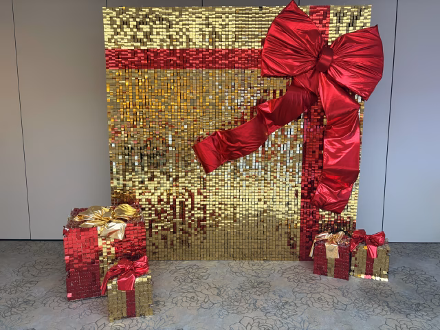 Make your celebration shine with our luxurious Gold Present Shimmer Wall. The ultimate statement backdrop to elevate any event. Designed to captivate and delight, this stunning feature wall is made up of hundreds of panels of gold and red that catch the light creating a dazzling, reflective effect that instantly transforms any space. with its giant red foil fabric bow to match.