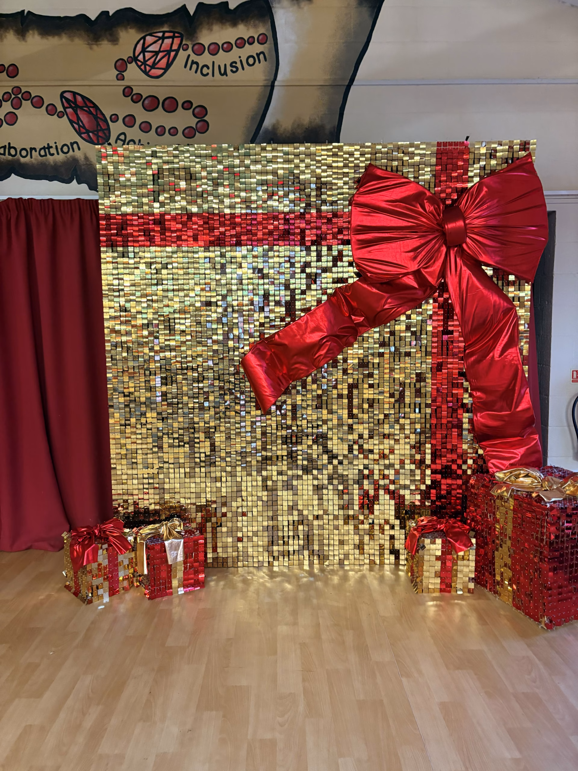 We believe your event should feel unique and unforgettable, and our gold present shimmer wall is designed to do just that. It comes with the giant red bow and 3d presents large one 60cm wide by 60cm tall and 60cm depth, small presents 30cm tall by 30cm wide and 30cm depth. With its sleek black foil fabric backing it looks great from all angles delivering maximum visual impact. It makes the perfect photo booth backdrop check out our mirror photo booth package (the 1.8m x1.8m plain gold shimmer wall comes included in the price) or our 360 infinity booth (plain gold shimmer corner 2.1m wide on two sides by 2.1m tall is included in the price)